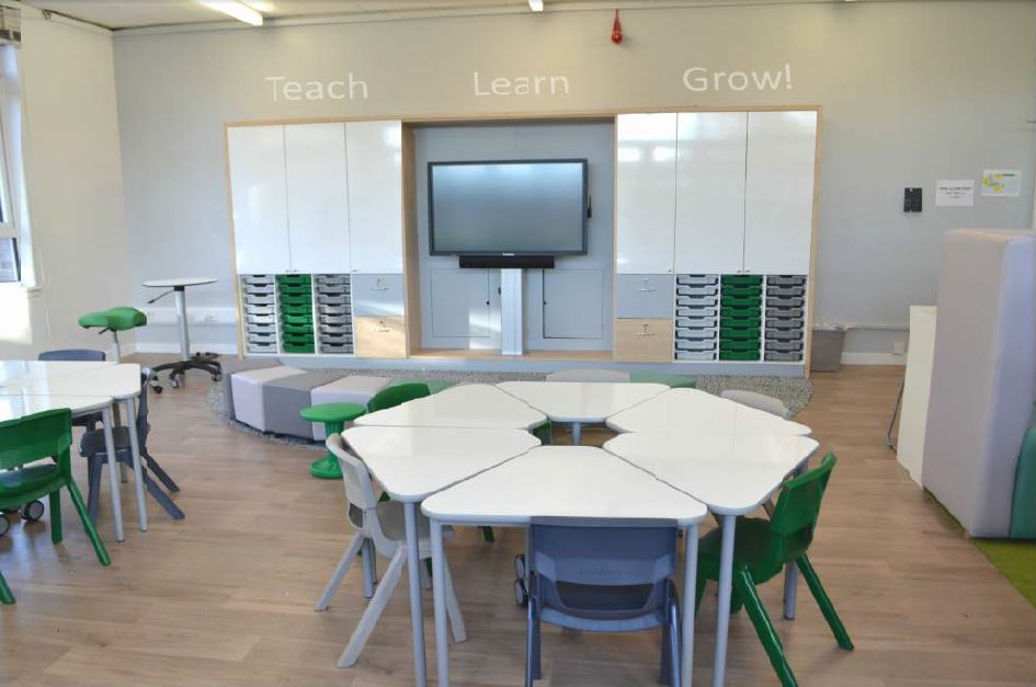 This classroom at Holy Cross Primary School was made into a general purpose space to allow all learners to have access to a new style of classroom. The school had seen the changes being made at other schools with the experimental classrooms and wanted the new style of space to benefit all learners. Mid-height furniture was used to allow all age groups to use it.