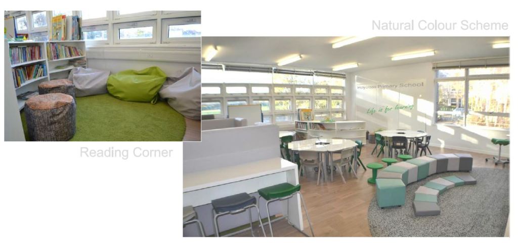 The interior design team used a muted colour background palette with highlights of the school colours to provide a balance between the over and under stimulation.