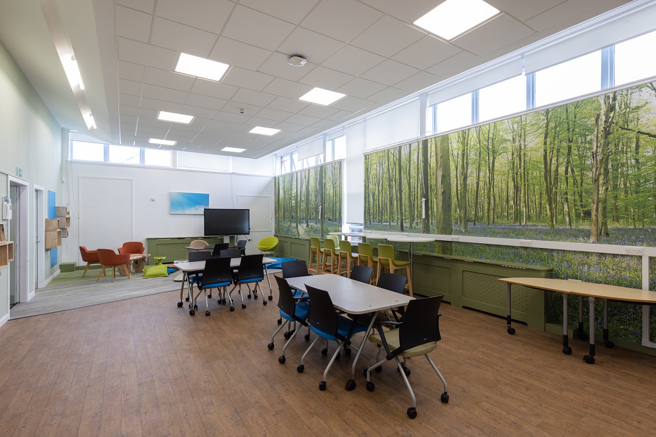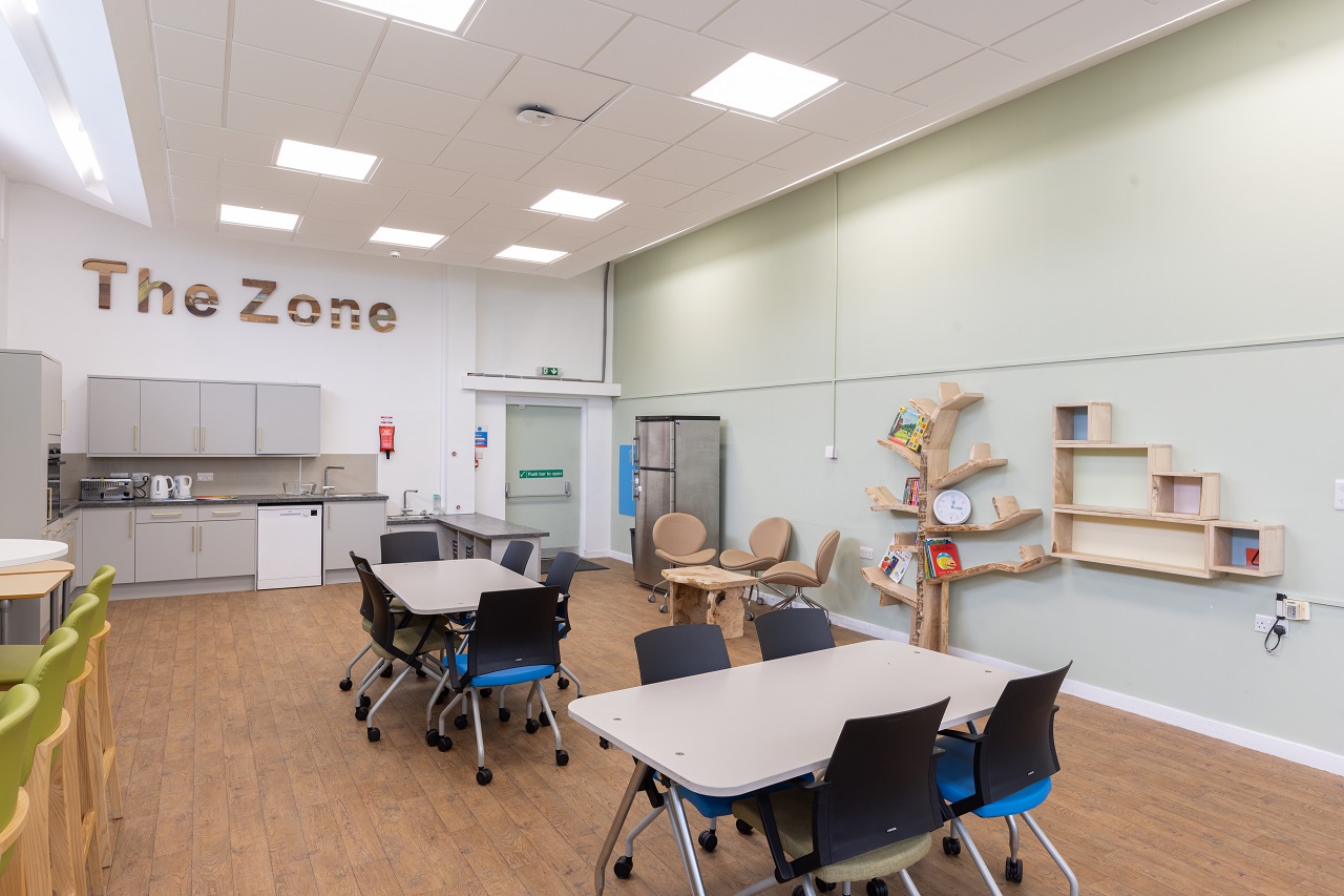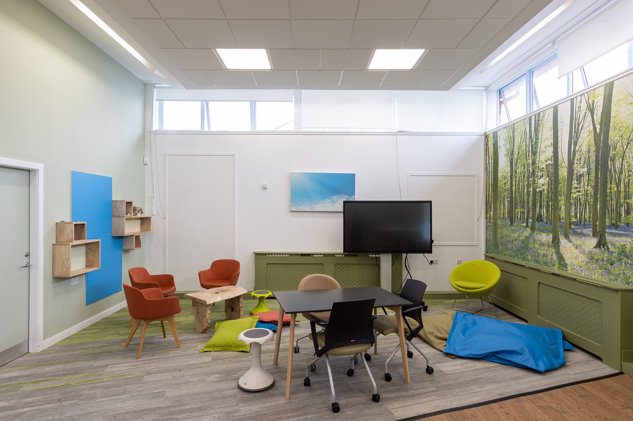 Wellbeing – Building on the pupils request to consider nature, we continued to explore biophilic design principles from finishes colour selection including a woodland scene and Scottish Bluebell wallpaper and timber furniture and signage made from upcycled timber – ‘The Zone’ the name for the space created by the pupils!