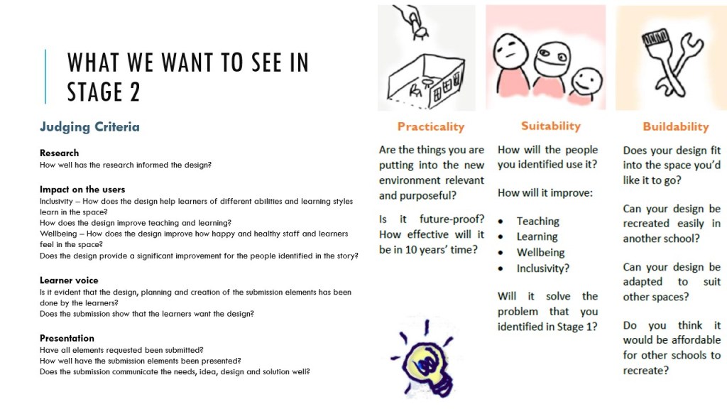 The three slides below show what we asked the entrants for in both stages of the competition, five schools were selected to move to Stage 2 with one winner being announced by John Swinney MP at the Education Buildings Conference in November 2019.