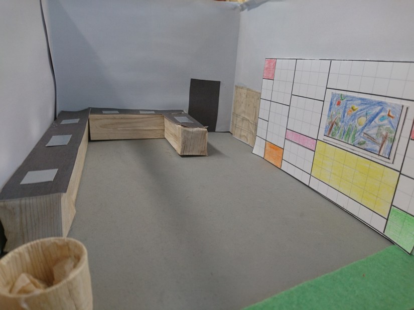 These are the design boards and model for St John Vianney’s environment design, showing a flexible room with a kitchen space for cooking classes, dining and learning space.