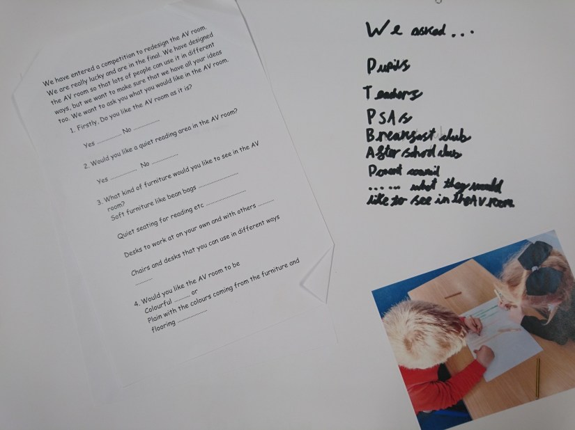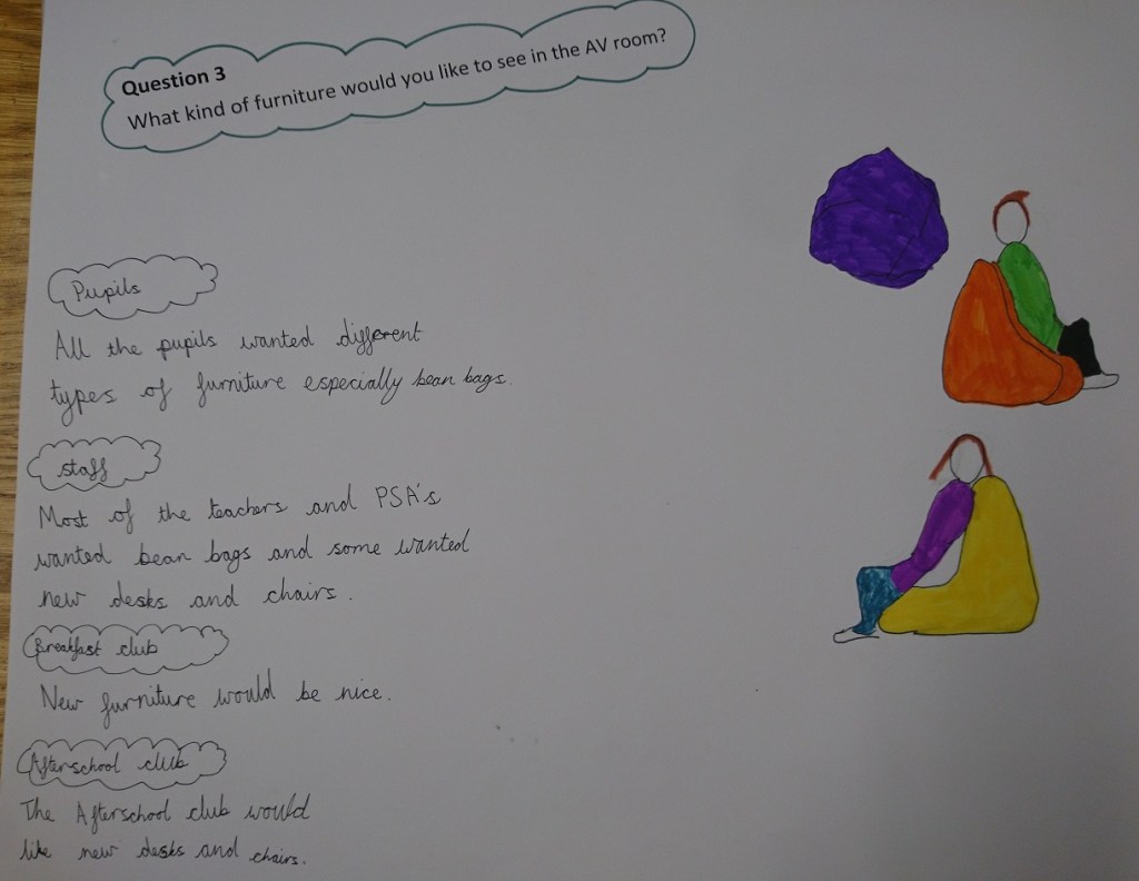 We are a group from Primary 5 at St John Vianney Primary School. Our school is in the Inch on the south side of Edinburgh. Last year when we were in Primary 4 our class decided to enter the Future Schools competition. We have a room called the AV room. Apparently, that stands for ‘audio visual’ room. Once upon a time the room was used for pupils to watch things on the tv, now everybody uses it for everything and uses it in different ways! But the room is old, empty, dull, bland and boring and doesn’t inspire us to learn. We want to create a space that works for everyone. A space that can change and adapt to meet the needs of everyone that uses it. Based on all our research and learning we have now created a design for a room with furniture and storage that can be used in different ways for all the different activities. A room that can be used by individuals, groups or whole classes. We want everyone who uses the room to walk into it and say WOW, this is a fantastic learning and doing space and I want to be here!