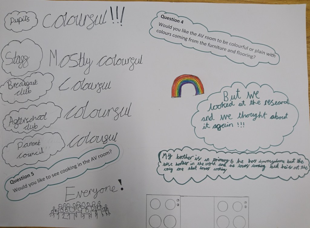 At the start of the design process I was on secondment at Architecture and Design Scotland developing work on agile learning spaces. I continued to work with the school on the engagement (just before lockdown) and St John Vianney’s was one of the schools I was lucky to get to in person engagement to develop the concept of a symbolic design language to use in co-design. On return to City of Edinburgh Council I worked with Pauline (Mrs Reid) and my colleague Barbara Harvey who led on the architectural and contract administration element to develop the design and adjust to communicating through teams which was a real learning experience for us all, however using a shared language to communicate design really did help the project. We also continued to engage with the University of Edinburgh Shared Learning research team throughout the development who supported us with communication and engagement alongside continuing proof of concept of the design language.
